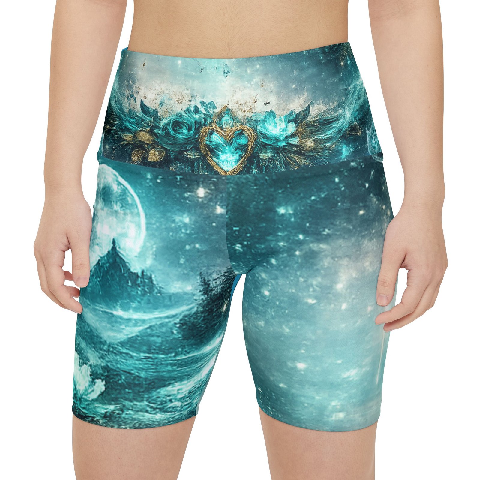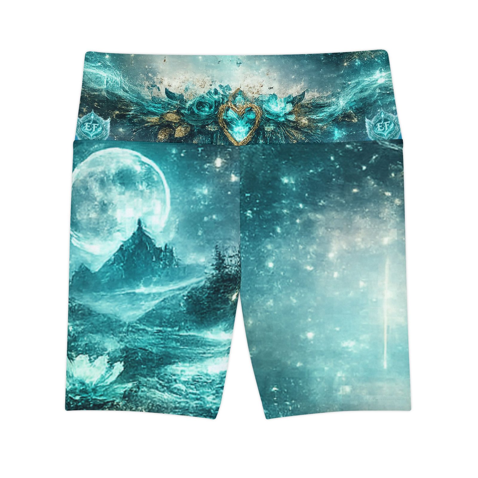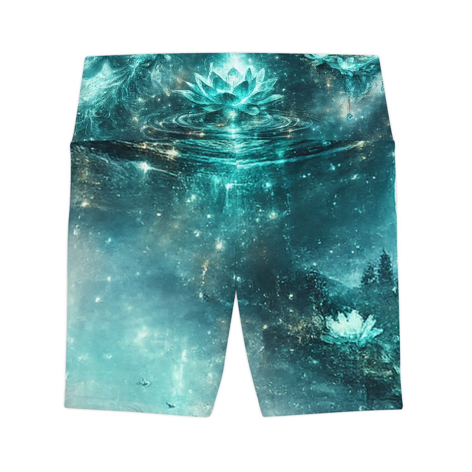 Float into movement with these artful workout shorts — a shimmering teal landscape wraps every stretch with quiet magic. The high-rise waistband is crowned with a soft mandala and heart emblem, while the front and back merge moonlit mountains and lotus ripples in painterly teal and aqua tones. They move with you: breathable, quick-drying polyester and a gusseted cut let yoga flows, runs, or at-home sessions feel effortless. Wear them for slow mornings, moonlight workouts, or when you want your practice to feel a little more enchanted. Product features – 100% polyester — durable, shape-retaining, quick-drying fabric – Vivid all-over print with bright, crisp colors – Gusset insert for improved range of motion and comfort – Printed size and care label on the inside waistband – Medium-heavy 8.5 oz/yd² fabric; assembled in the USA from globally sourced parts Care instructions – Do not dryclean – Do not iron – Tumble dry: low heat – Do not bleach – Machine wash: cold (max 30C or 90F)