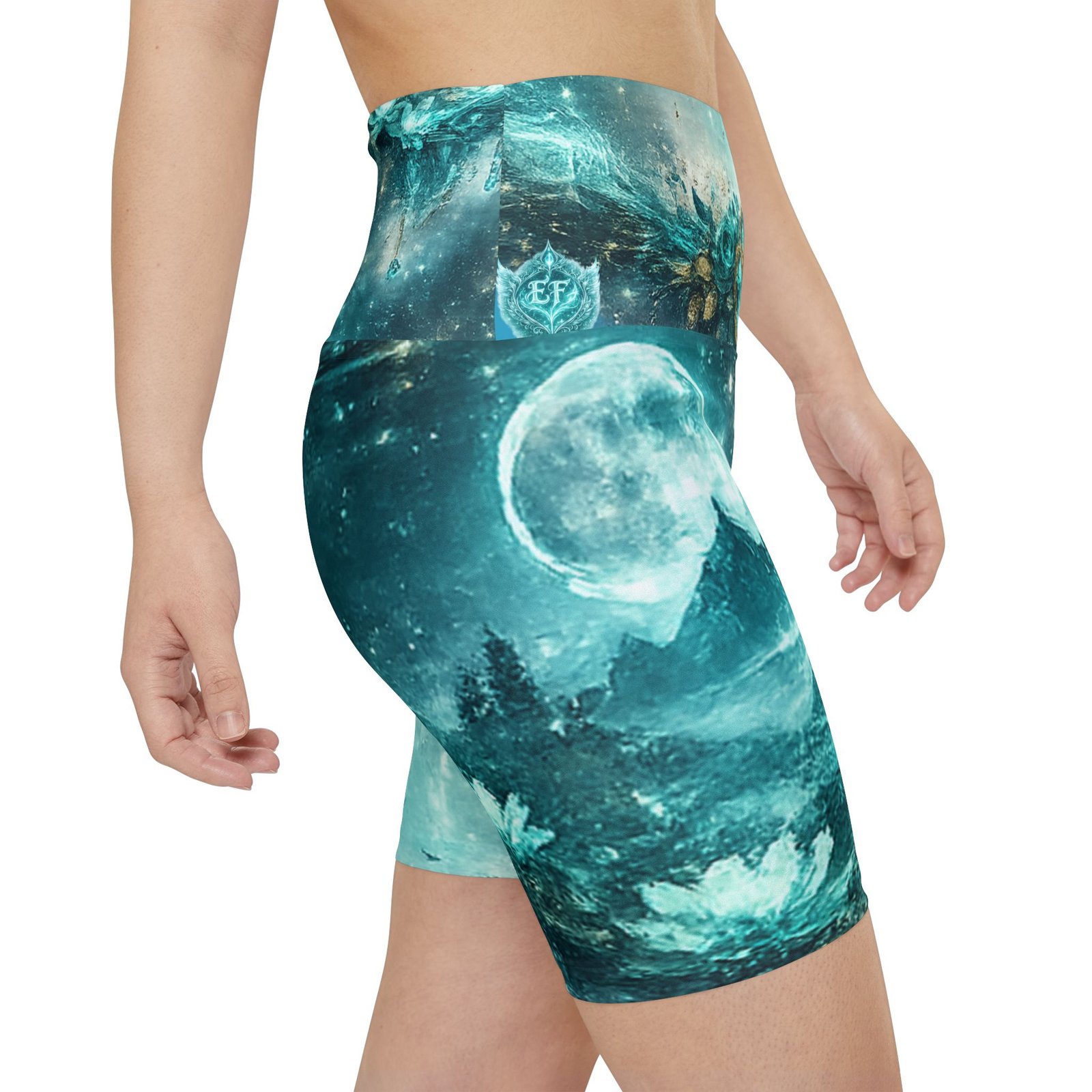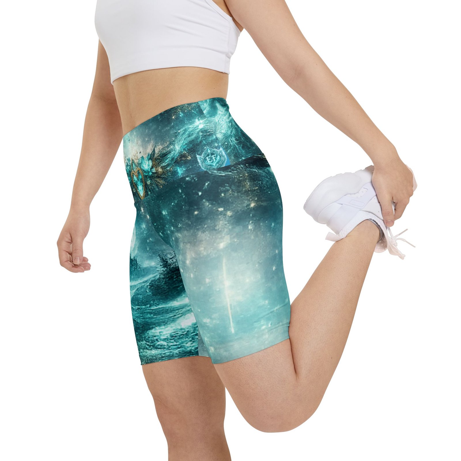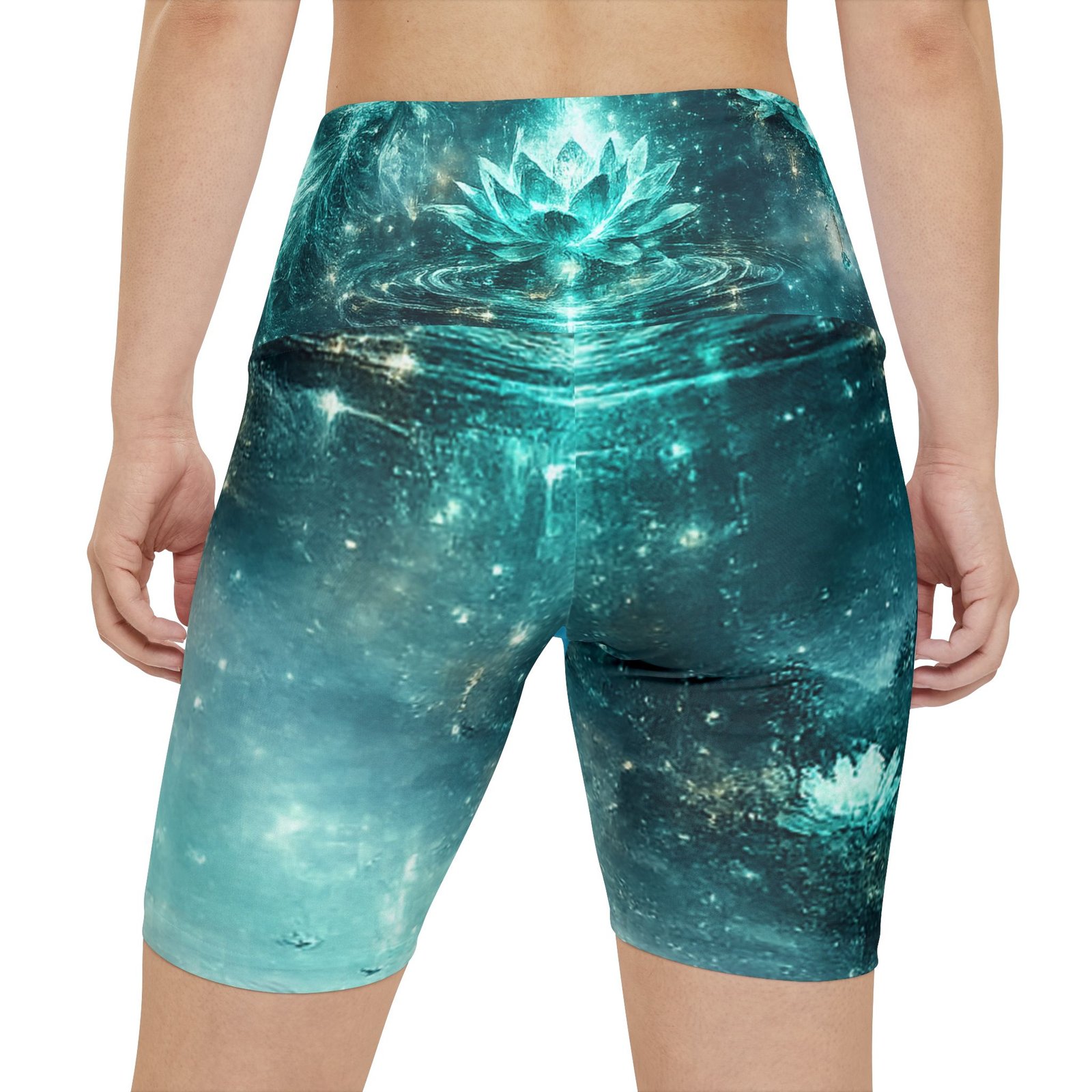 Float into movement with these artful workout shorts — a shimmering teal landscape wraps every stretch with quiet magic. The high-rise waistband is crowned with a soft mandala and heart emblem, while the front and back merge moonlit mountains and lotus ripples in painterly teal and aqua tones. They move with you: breathable, quick-drying polyester and a gusseted cut let yoga flows, runs, or at-home sessions feel effortless. Wear them for slow mornings, moonlight workouts, or when you want your practice to feel a little more enchanted. Product features – 100% polyester — durable, shape-retaining, quick-drying fabric – Vivid all-over print with bright, crisp colors – Gusset insert for improved range of motion and comfort – Printed size and care label on the inside waistband – Medium-heavy 8.5 oz/yd² fabric; assembled in the USA from globally sourced parts Care instructions – Do not dryclean – Do not iron – Tumble dry: low heat – Do not bleach – Machine wash: cold (max 30C or 90F)