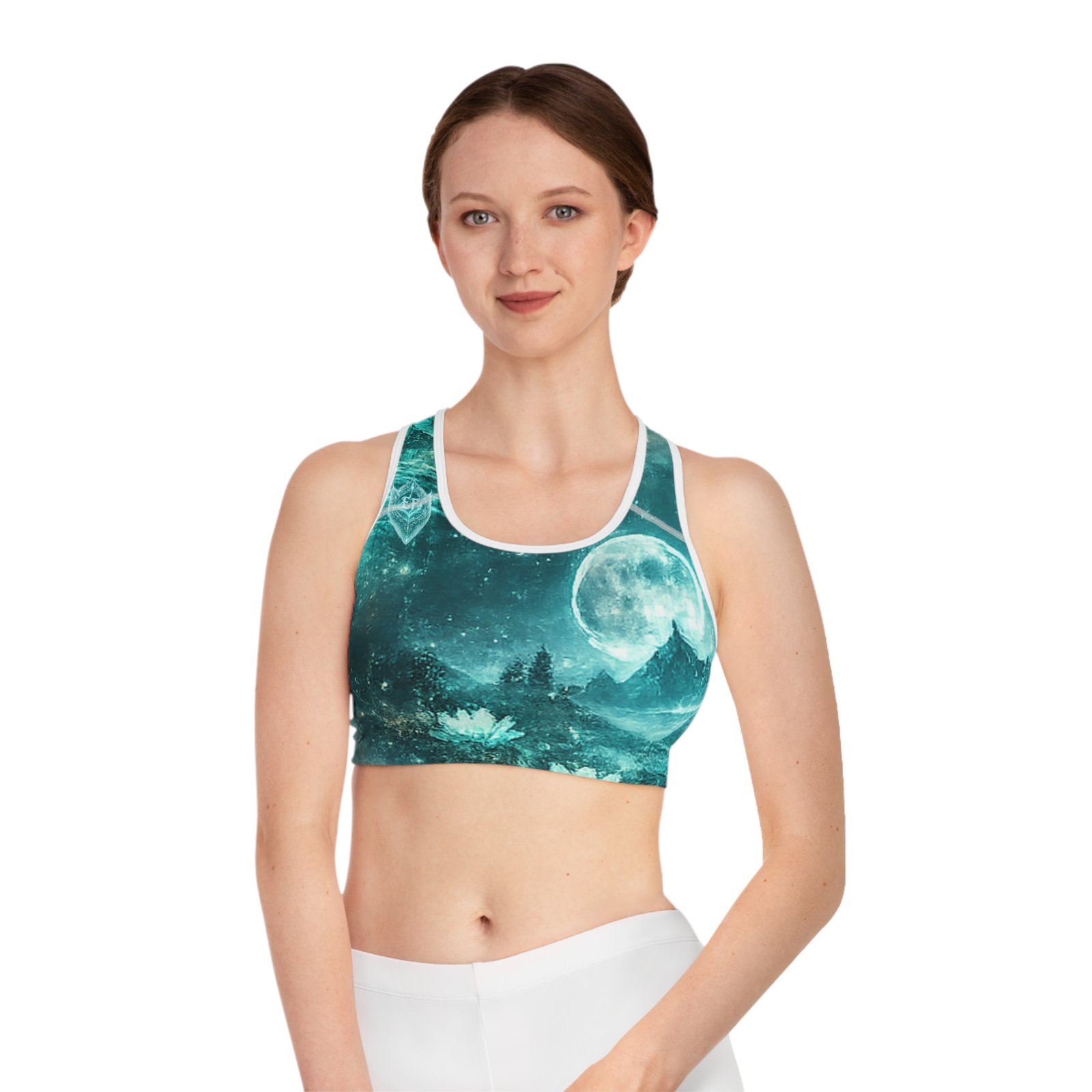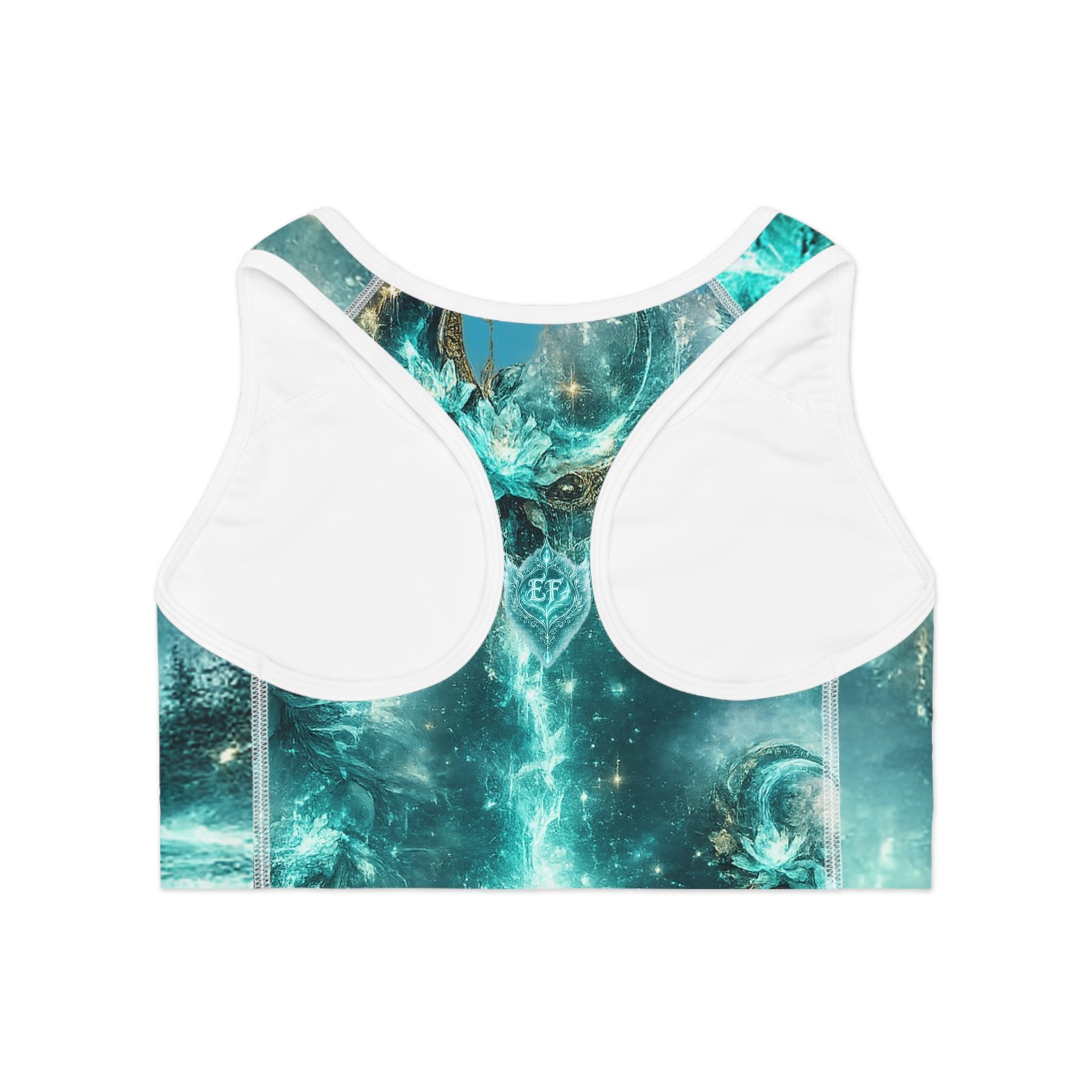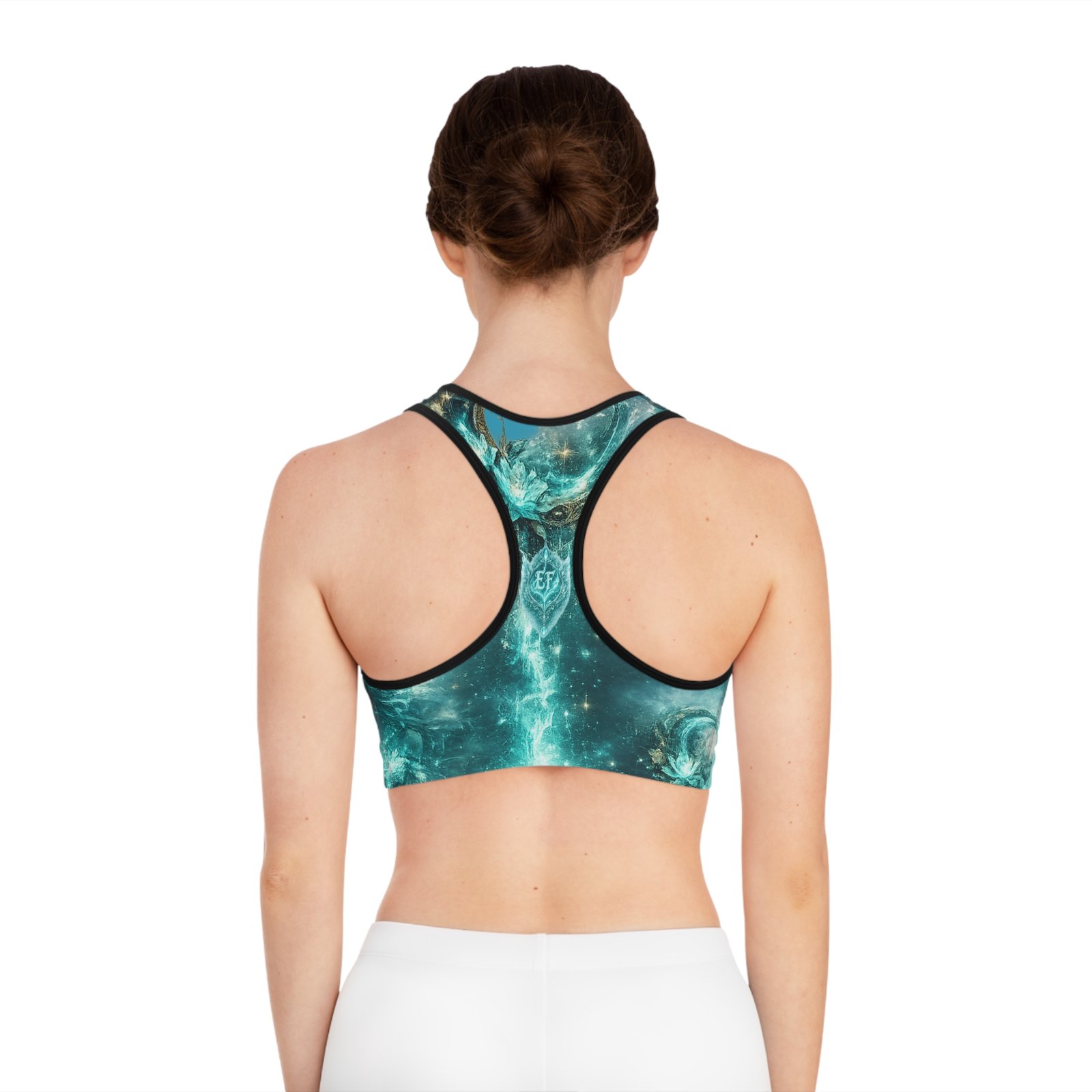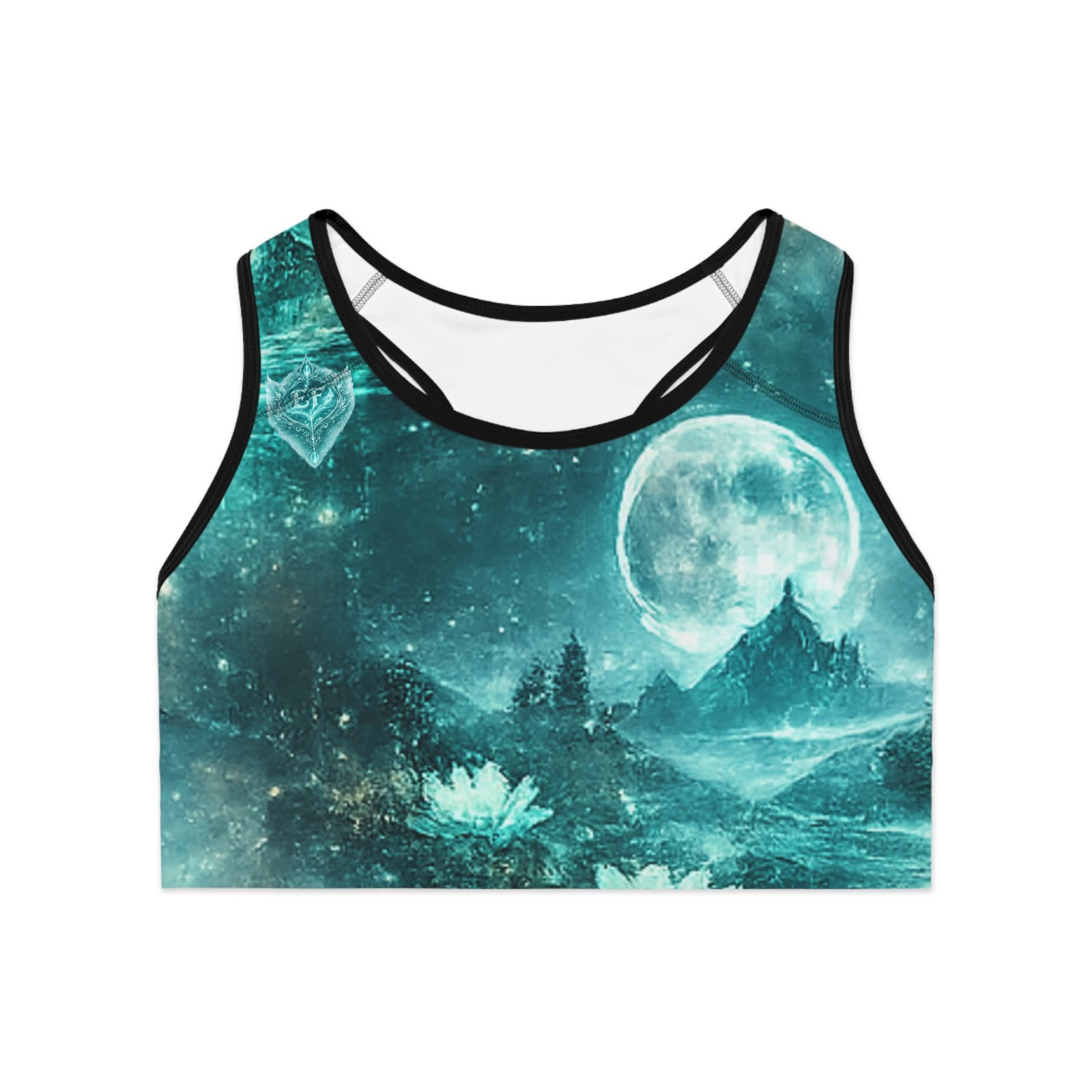 A teal-and-gold celestial sports bra that feels like wearing a private piece of the night sky. Soft, stretchy fabric hugs with a firm, compression fit while moisture-wicking fibers pull sweat away so focus stays on movement, not discomfort. The all-over print blends cosmic swirls, floral motifs, and a subtle heart-shaped emblem, giving the piece a mystical, feminine energy that moves with you through yoga flows, studio classes, or trail runs. The racerback cut and wide elastic band lock in support without digging in. Lightweight but structured, it layers cleanly under tops or stands alone when you want your practice to feel a little more magical. Product features – Moisture-wicking 83% polyester / 17% spandex blend – Compression fit with double-layer front for added support – All-over sublimated print covering the entire garment – Racerback design with wide elastic band for stable movement – Medium-weight fabric (6.5 oz/yd²) with tear-away neck label, assembled in USA Care instructions – Do not dryclean – Do not iron – Do not tumble dry – Do not bleach – Machine wash: cold (max 30C or 90F)