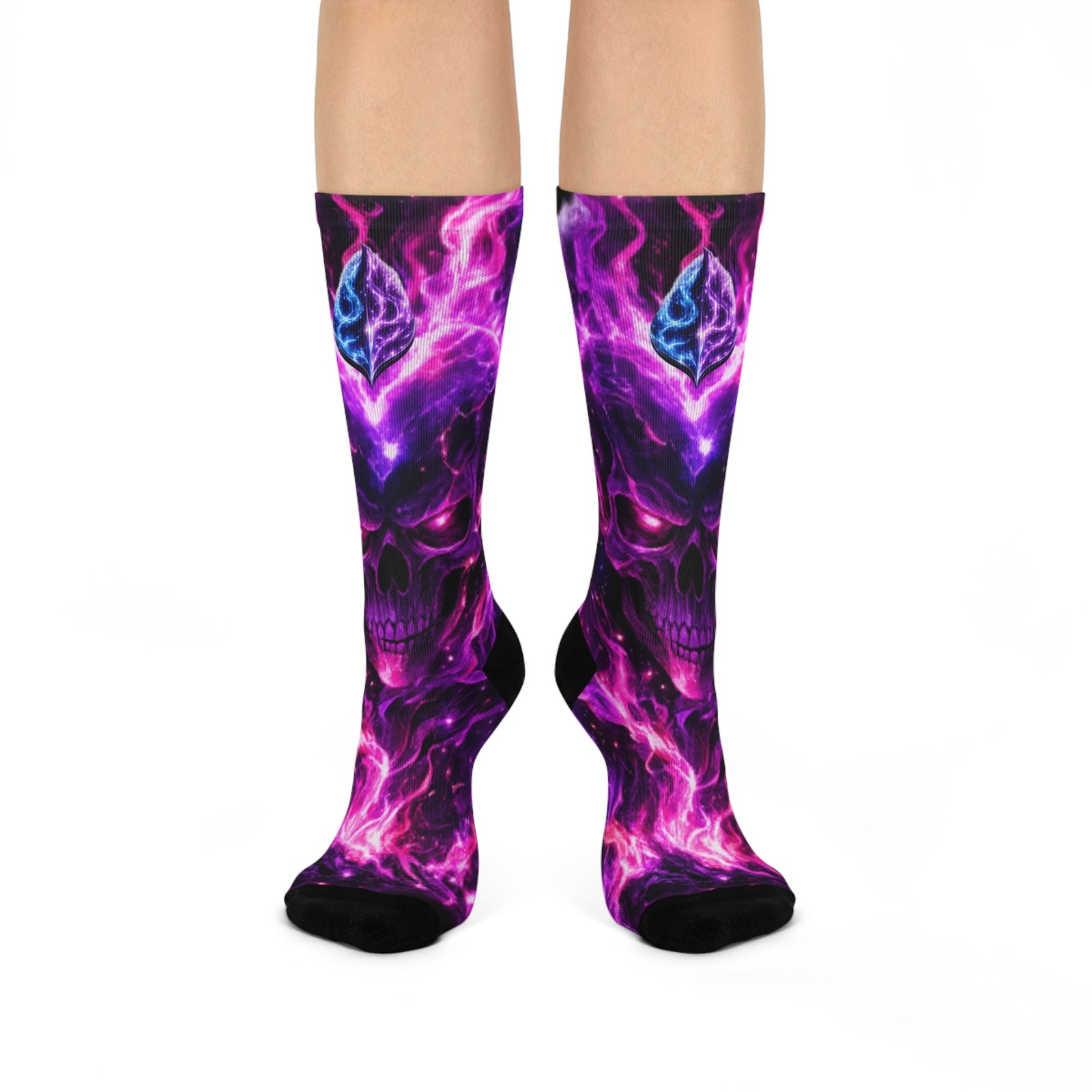 Slide into these cushioned crew socks and let the night sky come alive underfoot. Deep purples and electric pinks swirl into a cosmic flame pattern, with shadowed skull accents that peek through the nebula—bold but wearable. The smooth, stretchy knit wraps your calf in vibrant color while the reinforced black toe and heel add contrast and durability. With a plush cushioned sole and breathable stretch, they move with you through long days, late-night shows, or lazy mornings at home. Wear them with ankle boots, sneakers, or let them peek out from under a skirt for a little unexpected edge. Product features – All-over sublimation print with vivid, crisp colors – 200-needle premium knit for a smooth, high-detail finish – Cushioned bottoms for extra comfort during long wear – Stretchy, smooth fabric blend (73% polyester, 18% nylon, 3% cotton, 6% spandex) – One size fits women’s 5 to men’s 12 with reinforced black toe and heel Care instructions – Do not dryclean – Do not iron – Do not tumble dry – Do not bleach – Machine wash: cold (max 30C or 90F)