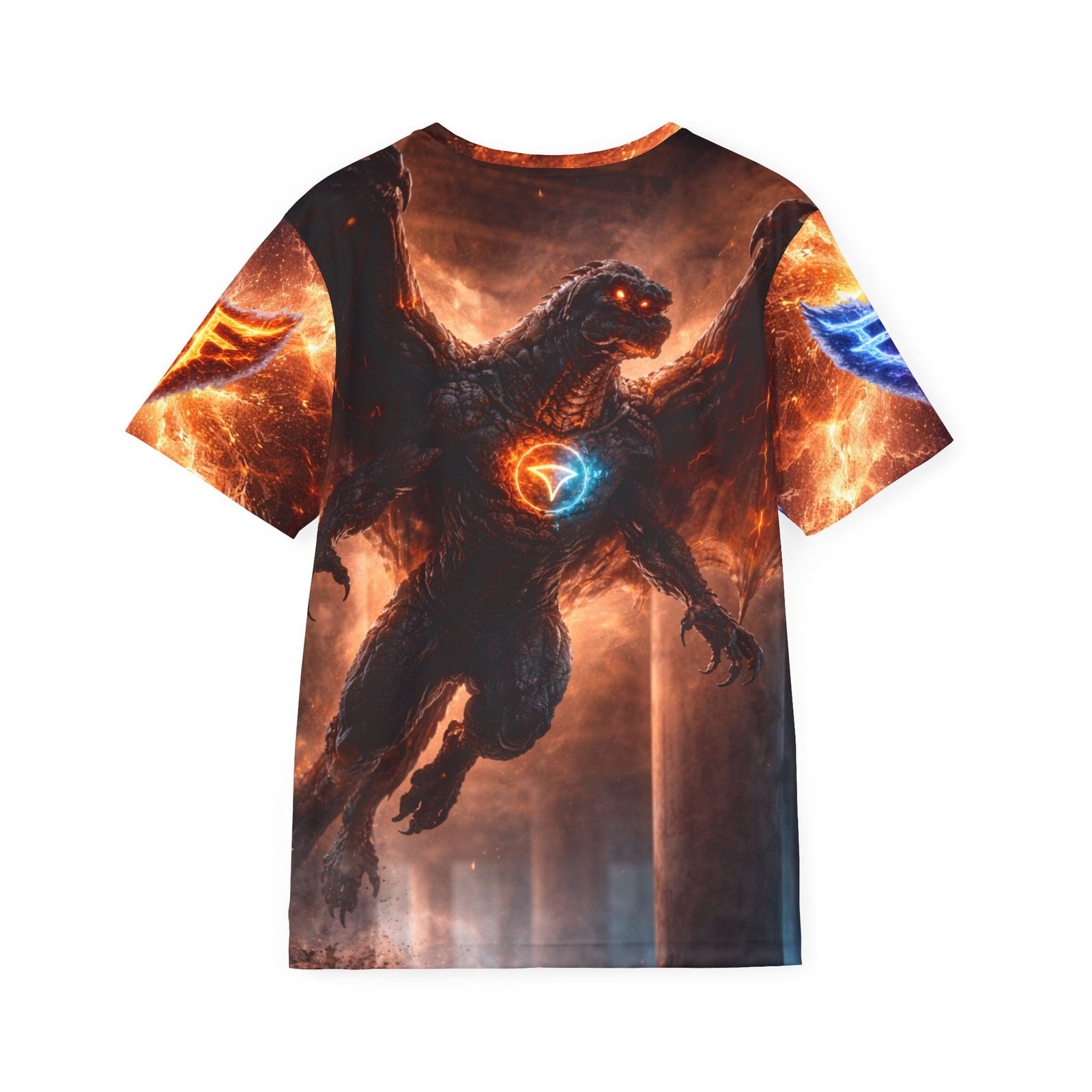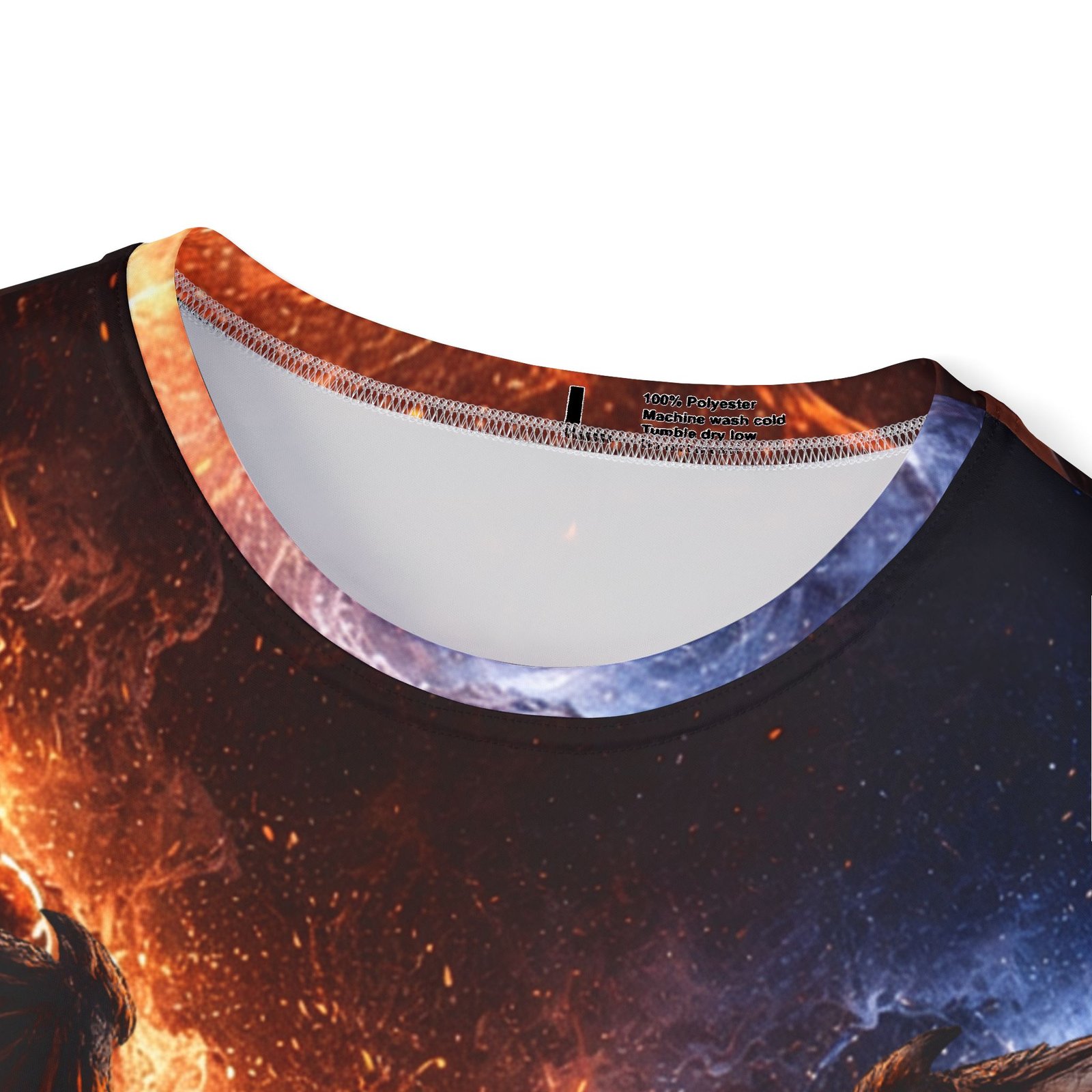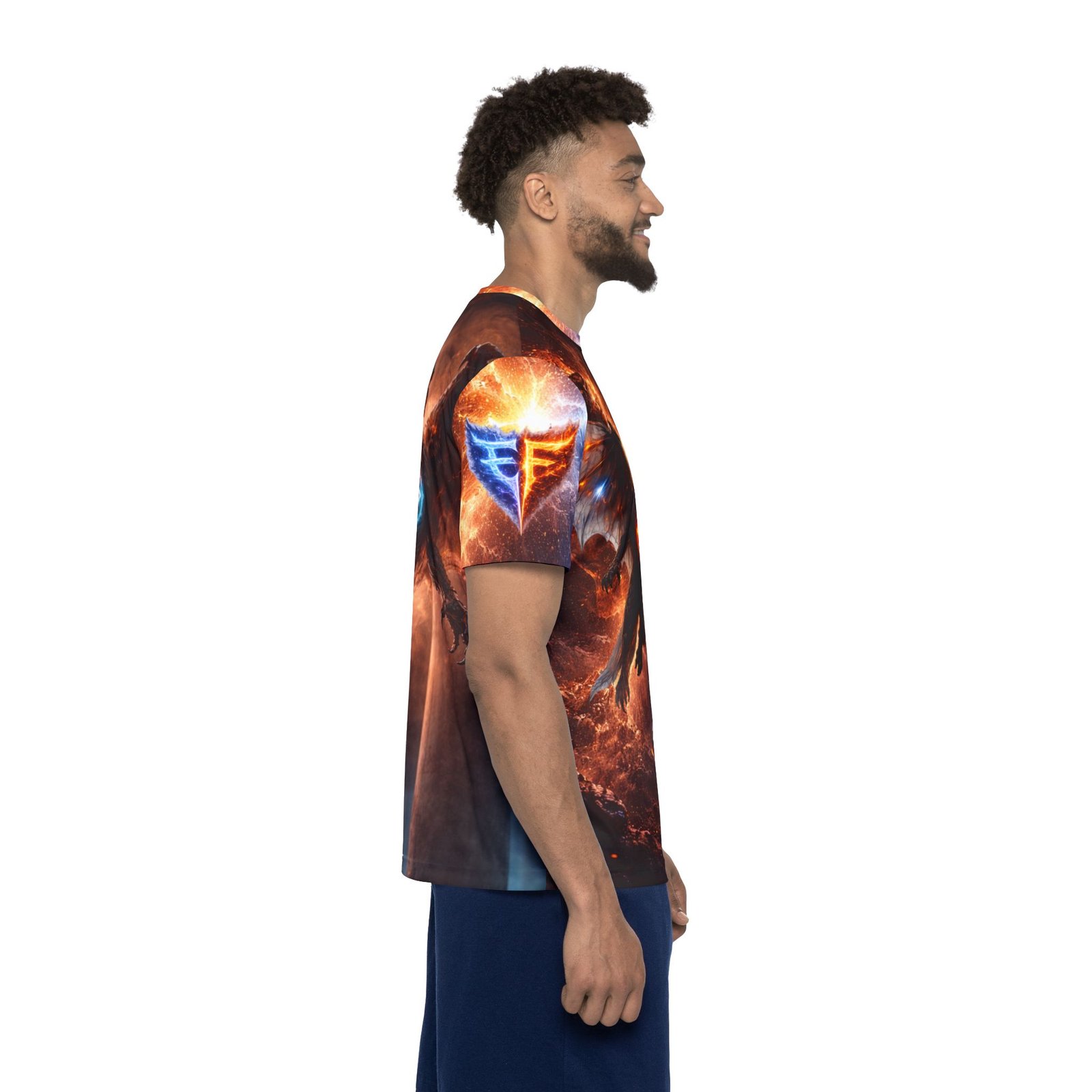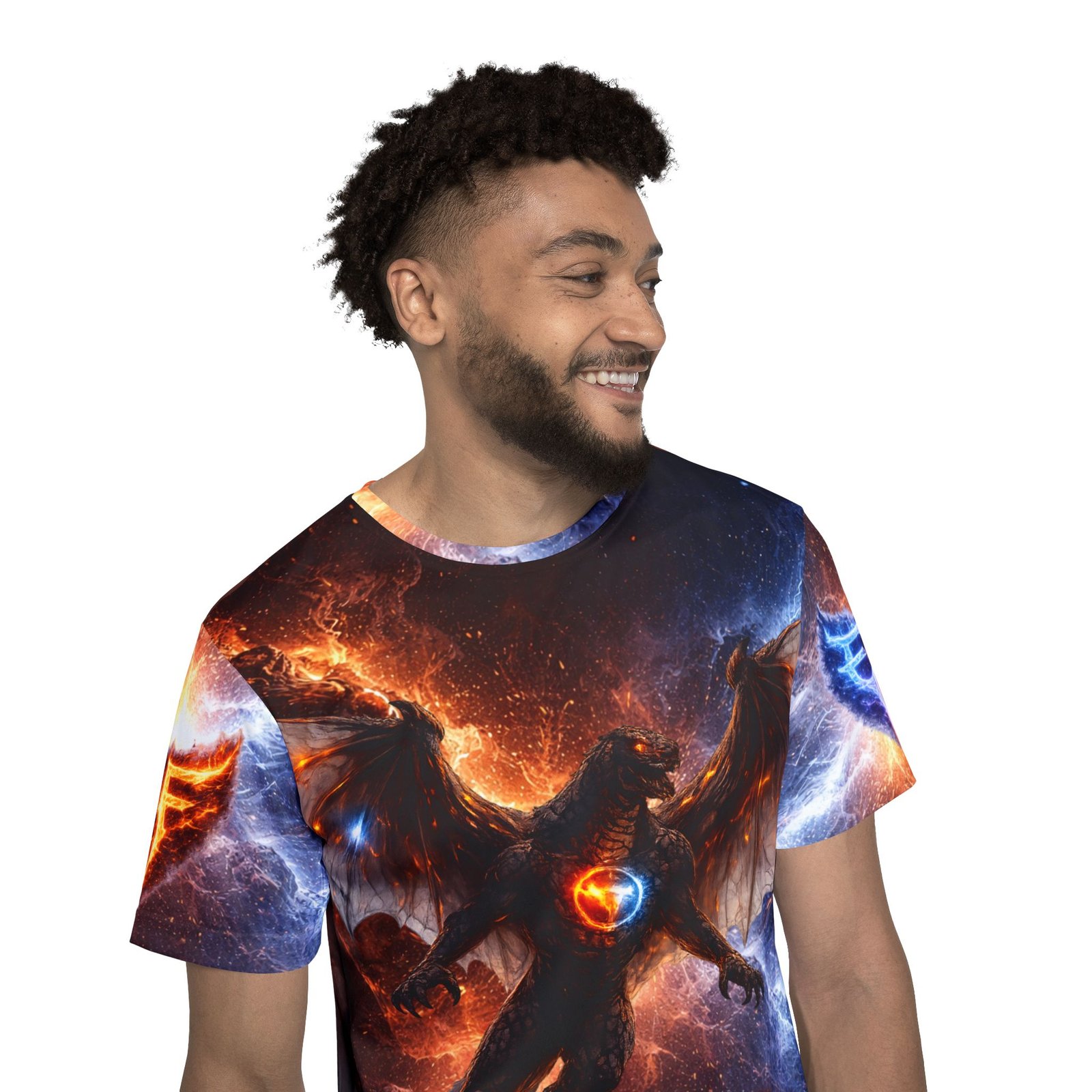 This all-over print sports jersey brings high-energy fantasy to everyday wear. A colossal dragon bursts through storm and flame across the front and back, its glowing core and embered wings rendered in vivid, saturated color. Lightweight, breathable fabric moves with you during intense sessions or long days on the go. The classic fit and ribbed collar keep the silhouette familiar while the moisture-wicking polyester keeps sweat at bay. Wear it when you want to channel that fierce, otherworldly momentum—training, gaming nights, conventions, or mornings when you need to feel unstoppable.