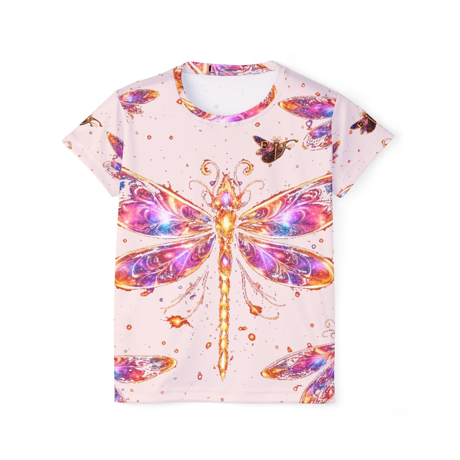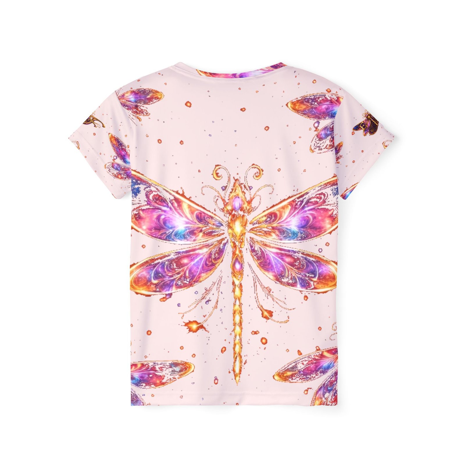 Float through summer light in this all-over-print sports jersey featuring a luminous watercolor dragonfly. The oversized wing motif spills across front and back in magentas, golds, and violet highlights against a soft blush ground — it feels like catching the sun on a pond at golden hour. Breathable, extra-light performance fabric moves with you during runs, yoga, or long walks, and the moisture-wicking polyester keeps skin cool even when your pace picks up. The ribbed collar and armholes stretch for easy on/off and return to shape for a clean, tailored look. Wear it when you want color that reads like art and function that keeps up with active days or slow, reflective ones.