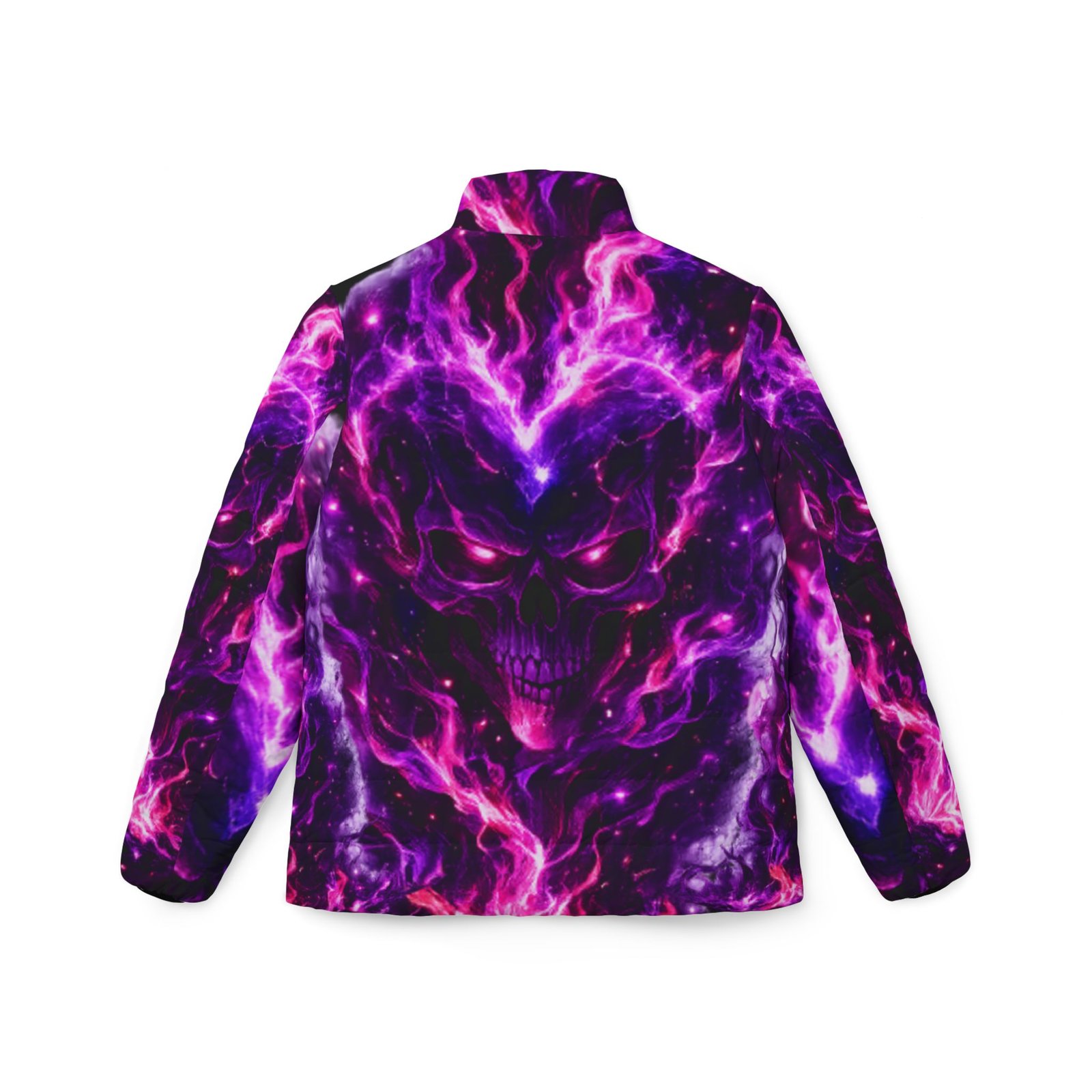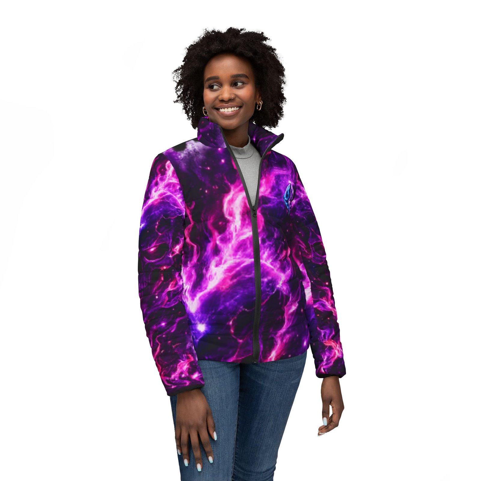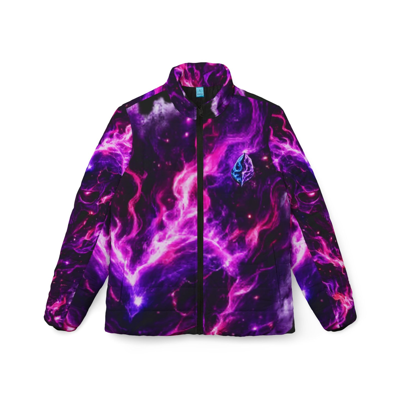 A bold, cosmic puffer that feels like stepping into a neon nebula. Rich purples and electric magentas swirl across a warm, quilted shell — a striking outer layer that keeps the cold out and the attitude in. Lightweight but substantial, the jacket’s soft padded lining and secure full zipper bring everyday ease while the angled side pockets tuck hands and small essentials away. Wear it on late-night walks, to underground shows, or layered over hoodies for city winters; the design reads like wearable art, made for people who chase color and don’t hide from contrast.