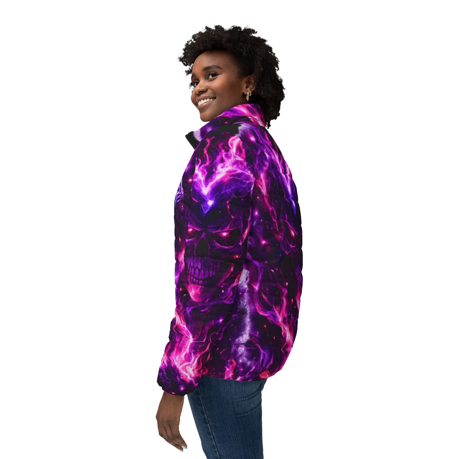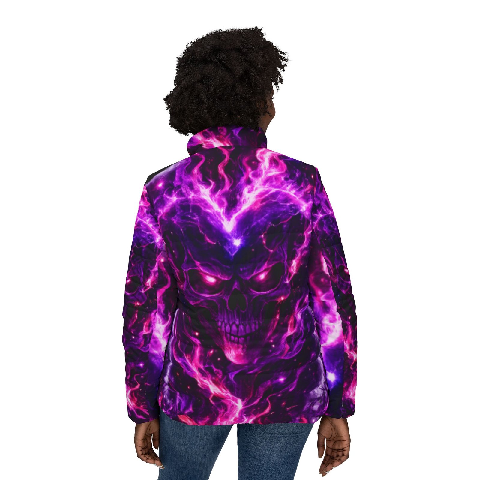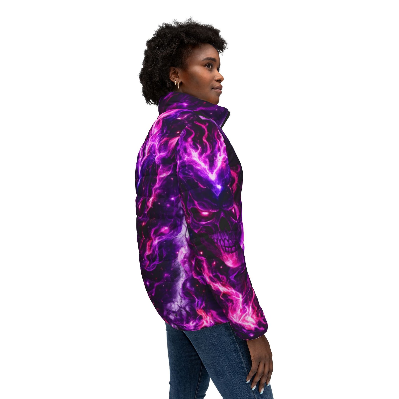 A bold, cosmic puffer that feels like stepping into a neon nebula. Rich purples and electric magentas swirl across a warm, quilted shell — a striking outer layer that keeps the cold out and the attitude in. Lightweight but substantial, the jacket’s soft padded lining and secure full zipper bring everyday ease while the angled side pockets tuck hands and small essentials away. Wear it on late-night walks, to underground shows, or layered over hoodies for city winters; the design reads like wearable art, made for people who chase color and don’t hide from contrast.