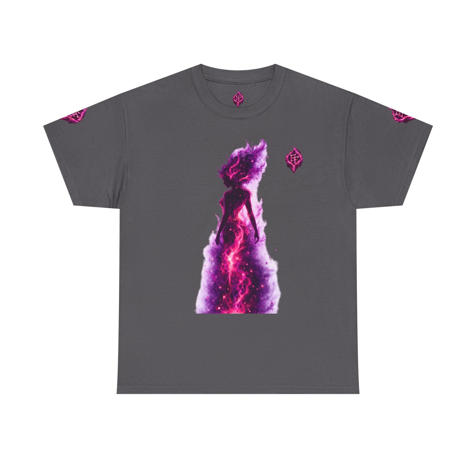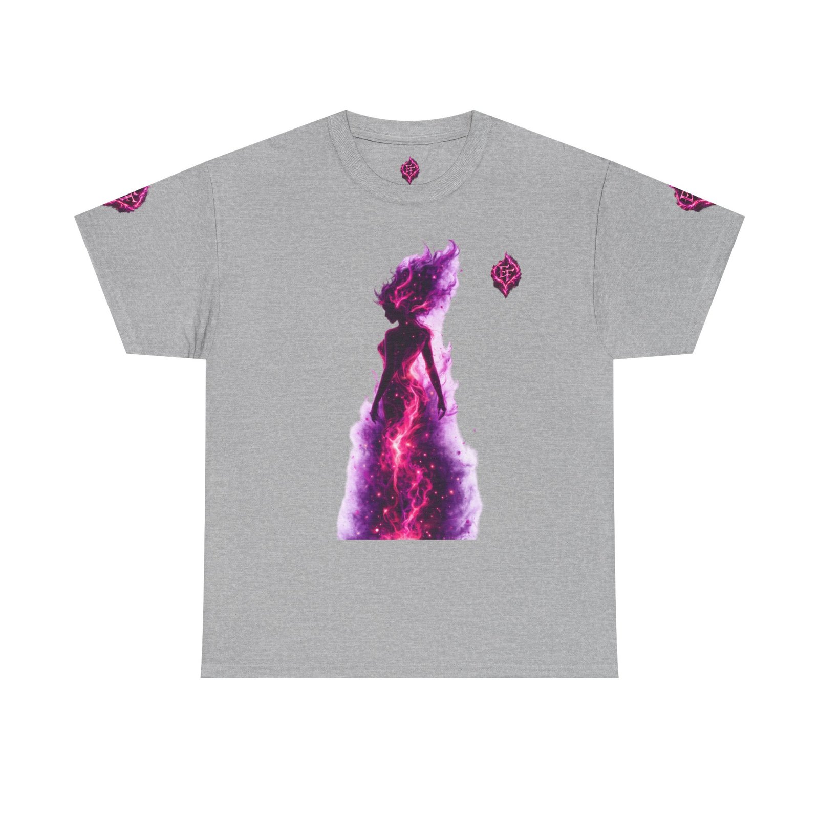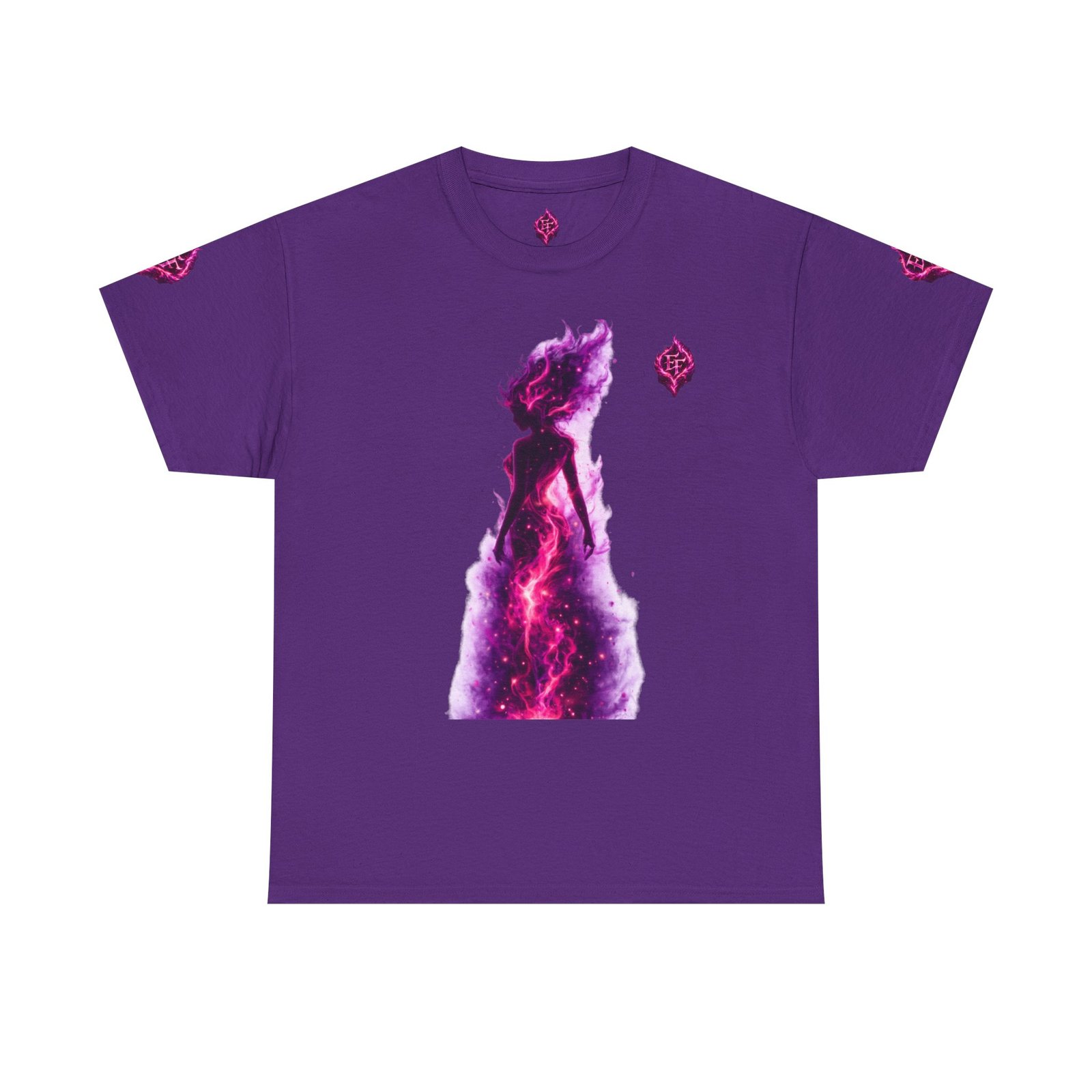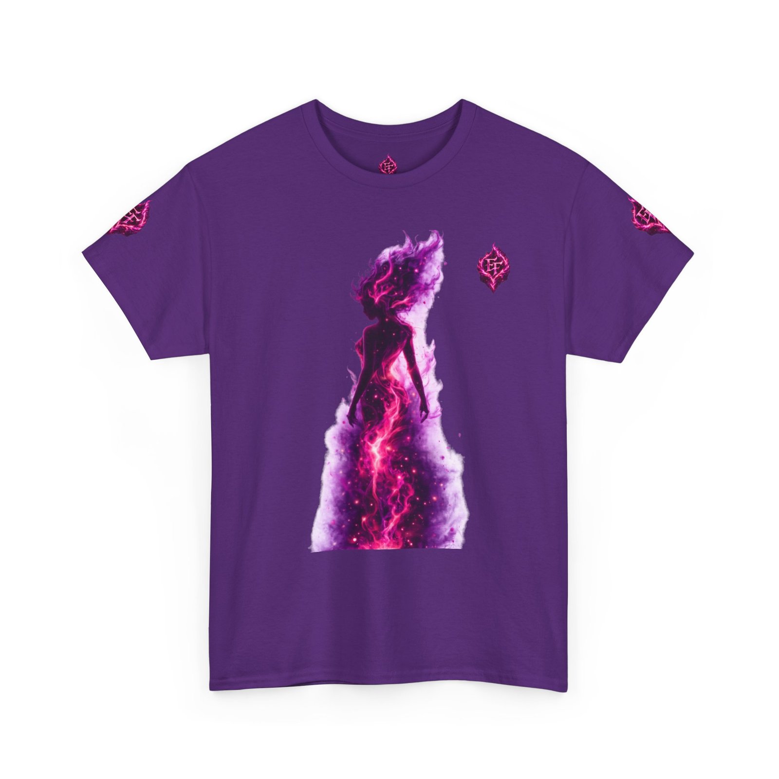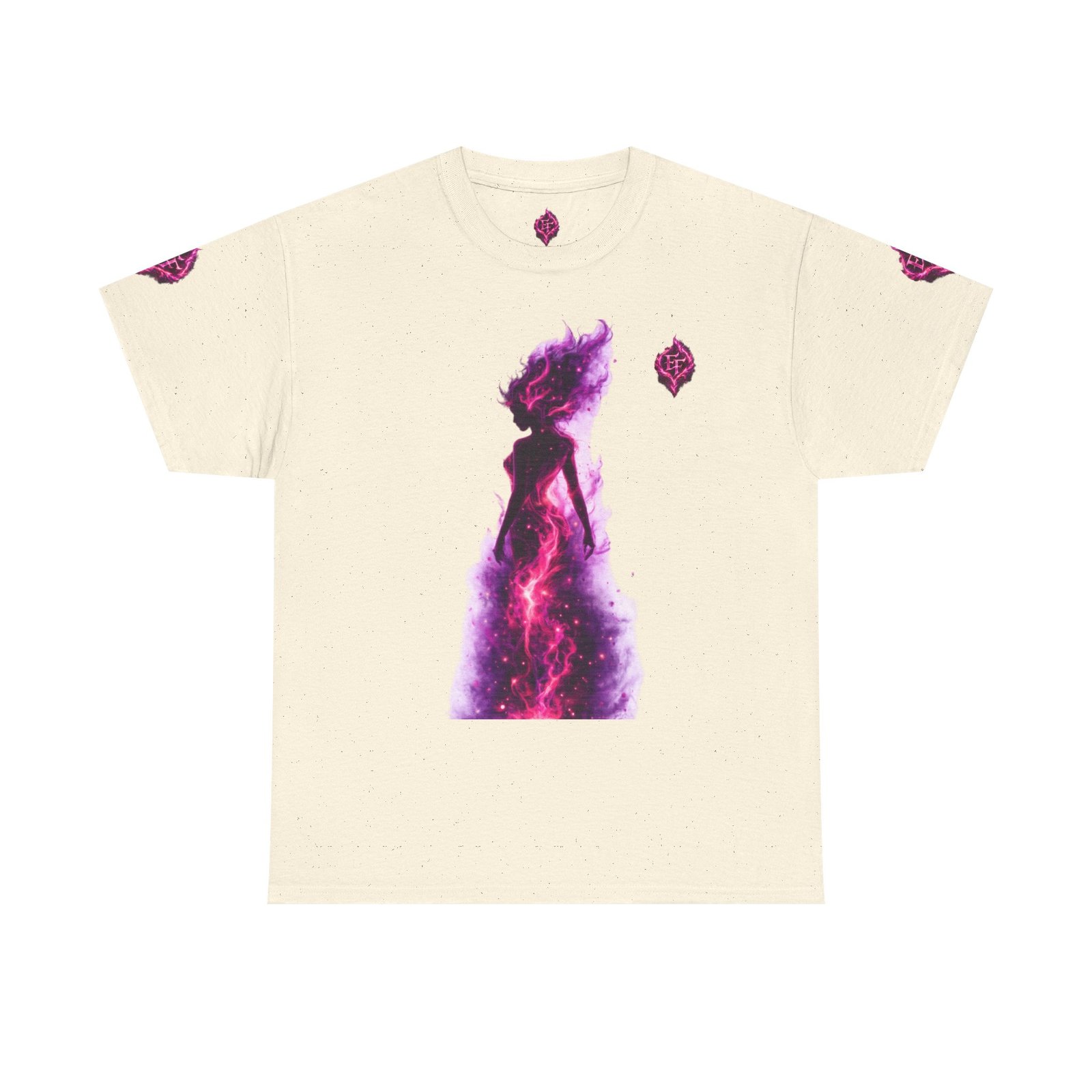 This tee feels like wearing a pulse of starlight. A soft, sturdy cotton canvas carries vibrant magenta-and-violet graphics: a smoldering heart on the chest and a silhouette of a fiery figure on the back, both rendered like cosmic flames. The imagery reads as bold and otherworldly — equal parts galaxy energy and raw emotion — made for someone who wants their outfit to tell a story without saying a word. The classic crew neck and relaxed fit let the art take center stage while staying comfortable for all-day wear. It’s breathable, responsibly sourced, and finished with tear-away labeling so nothing distracts from the look or the feel.