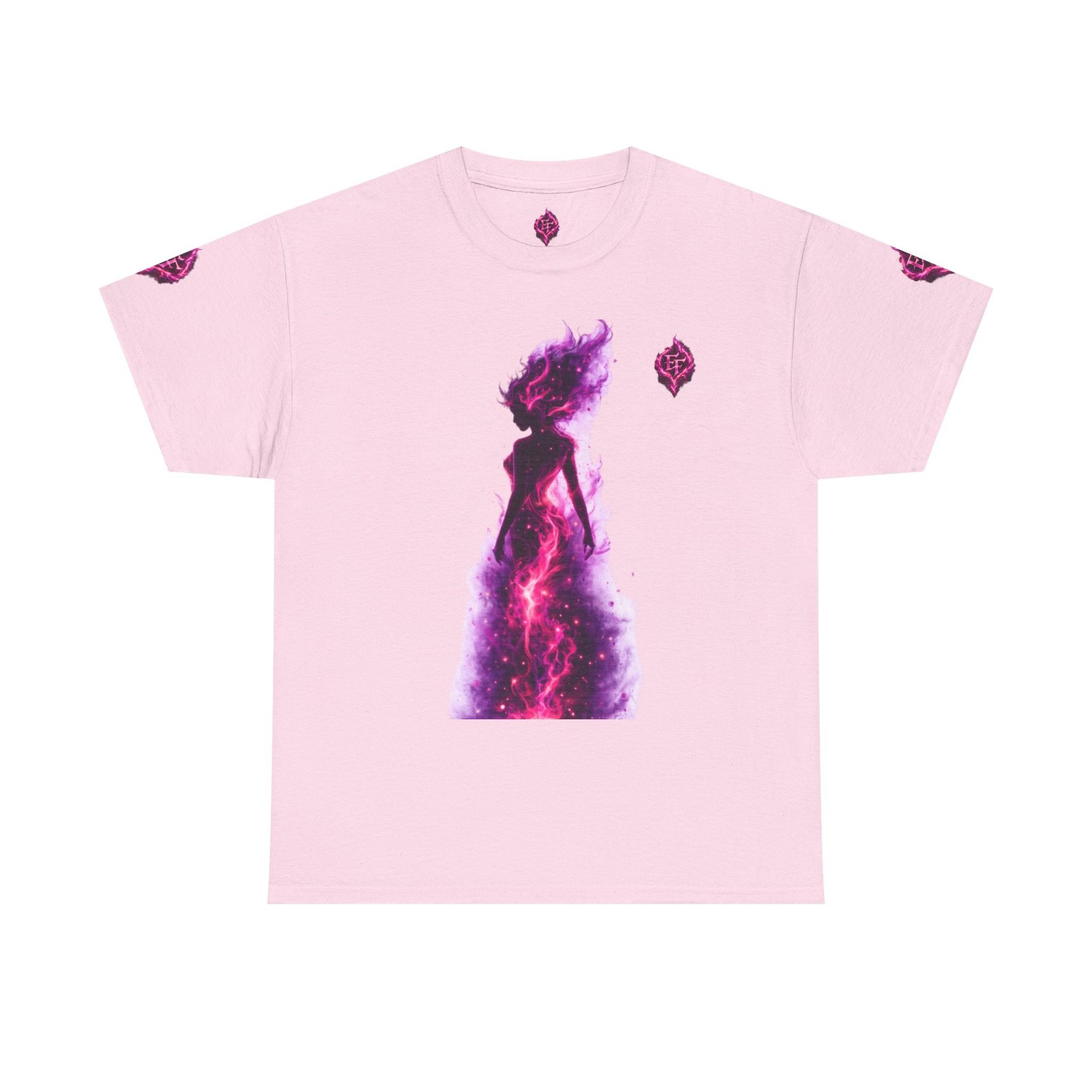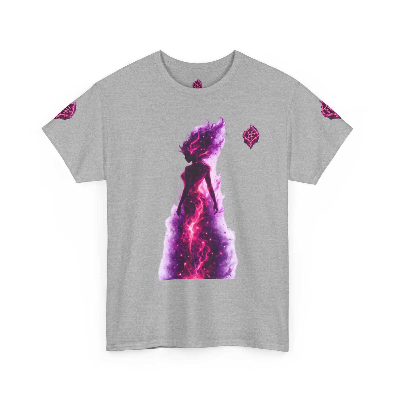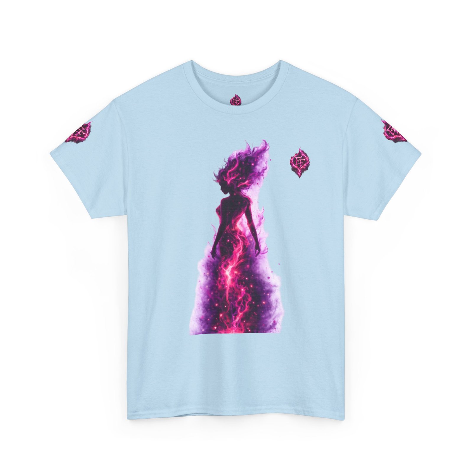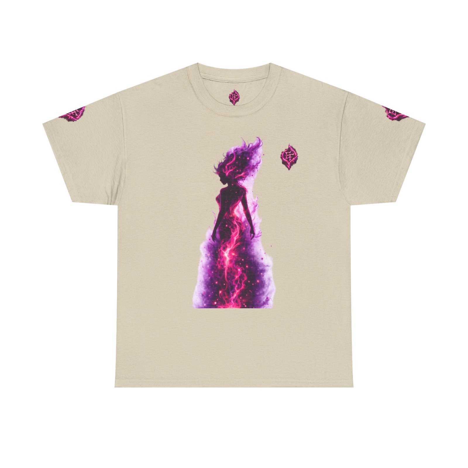 This tee feels like wearing a pulse of starlight. A soft, sturdy cotton canvas carries vibrant magenta-and-violet graphics: a smoldering heart on the chest and a silhouette of a fiery figure on the back, both rendered like cosmic flames. The imagery reads as bold and otherworldly — equal parts galaxy energy and raw emotion — made for someone who wants their outfit to tell a story without saying a word. The classic crew neck and relaxed fit let the art take center stage while staying comfortable for all-day wear. It’s breathable, responsibly sourced, and finished with tear-away labeling so nothing distracts from the look or the feel.
