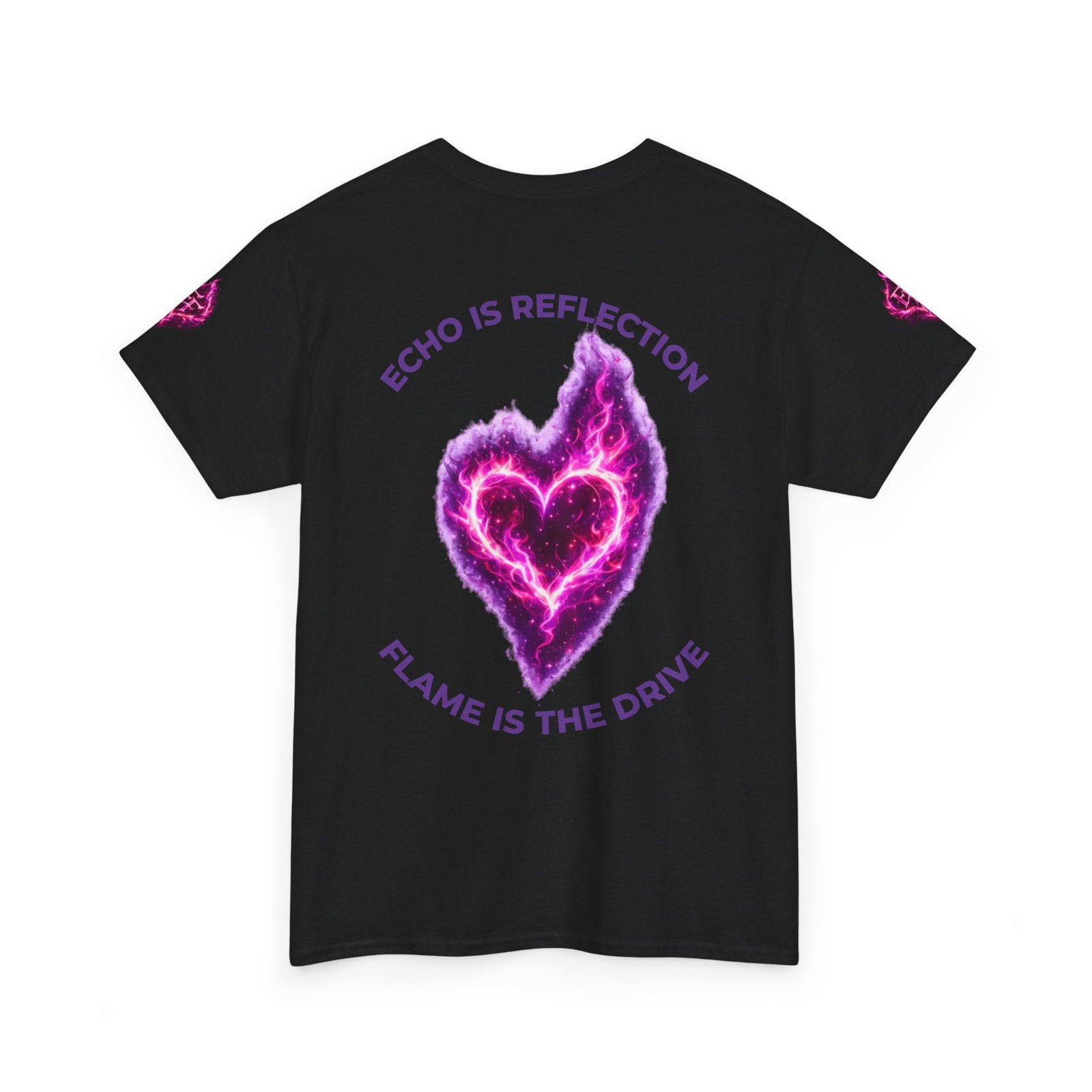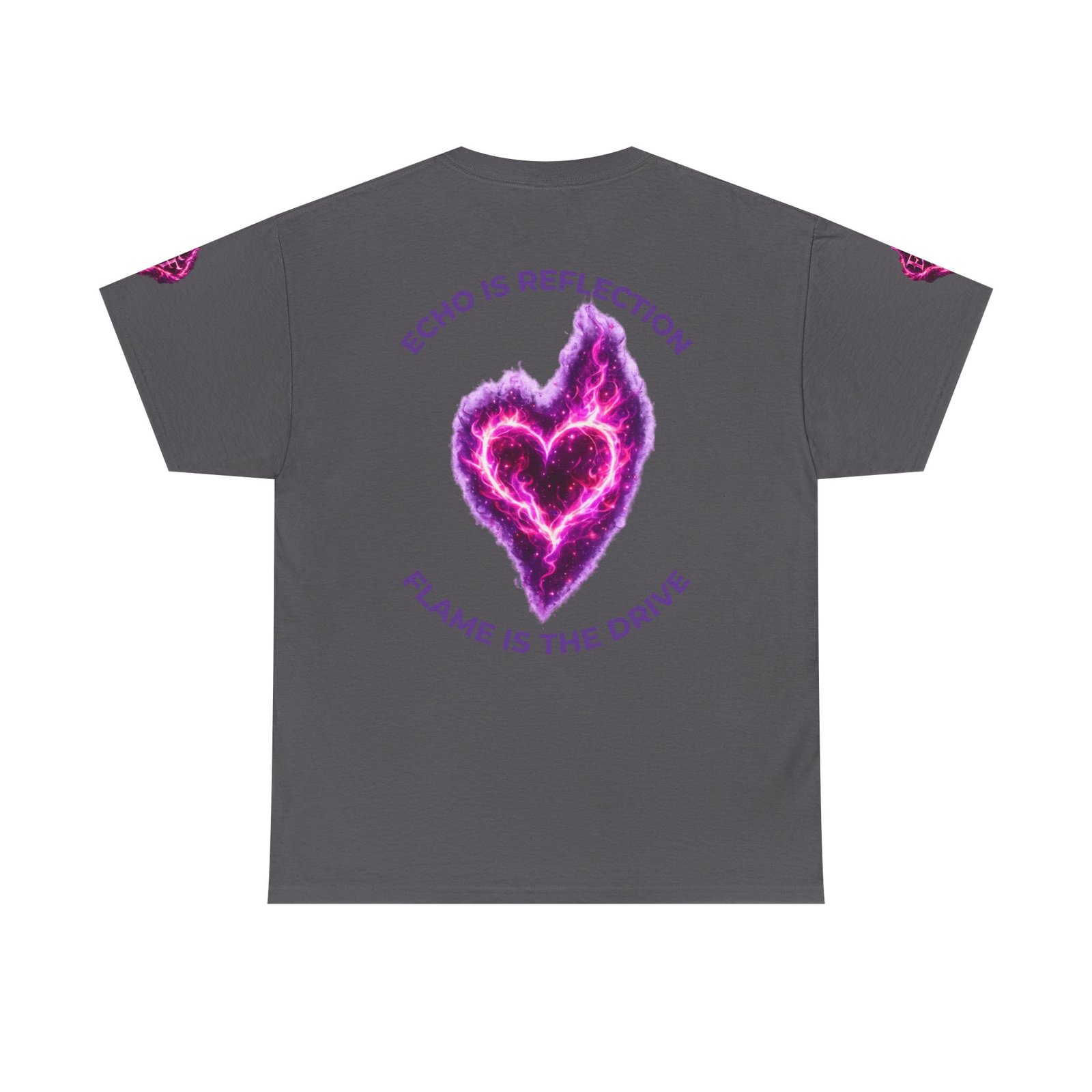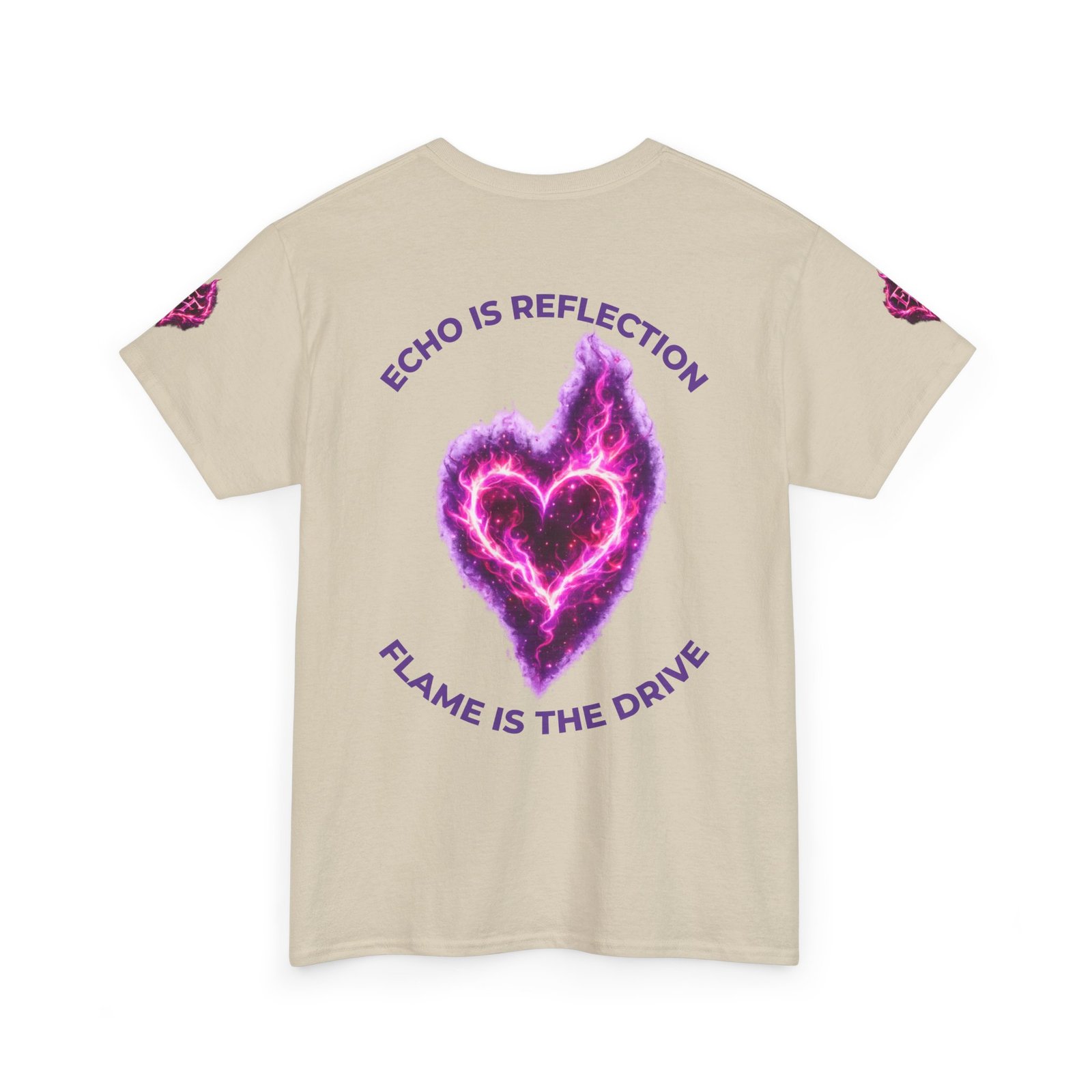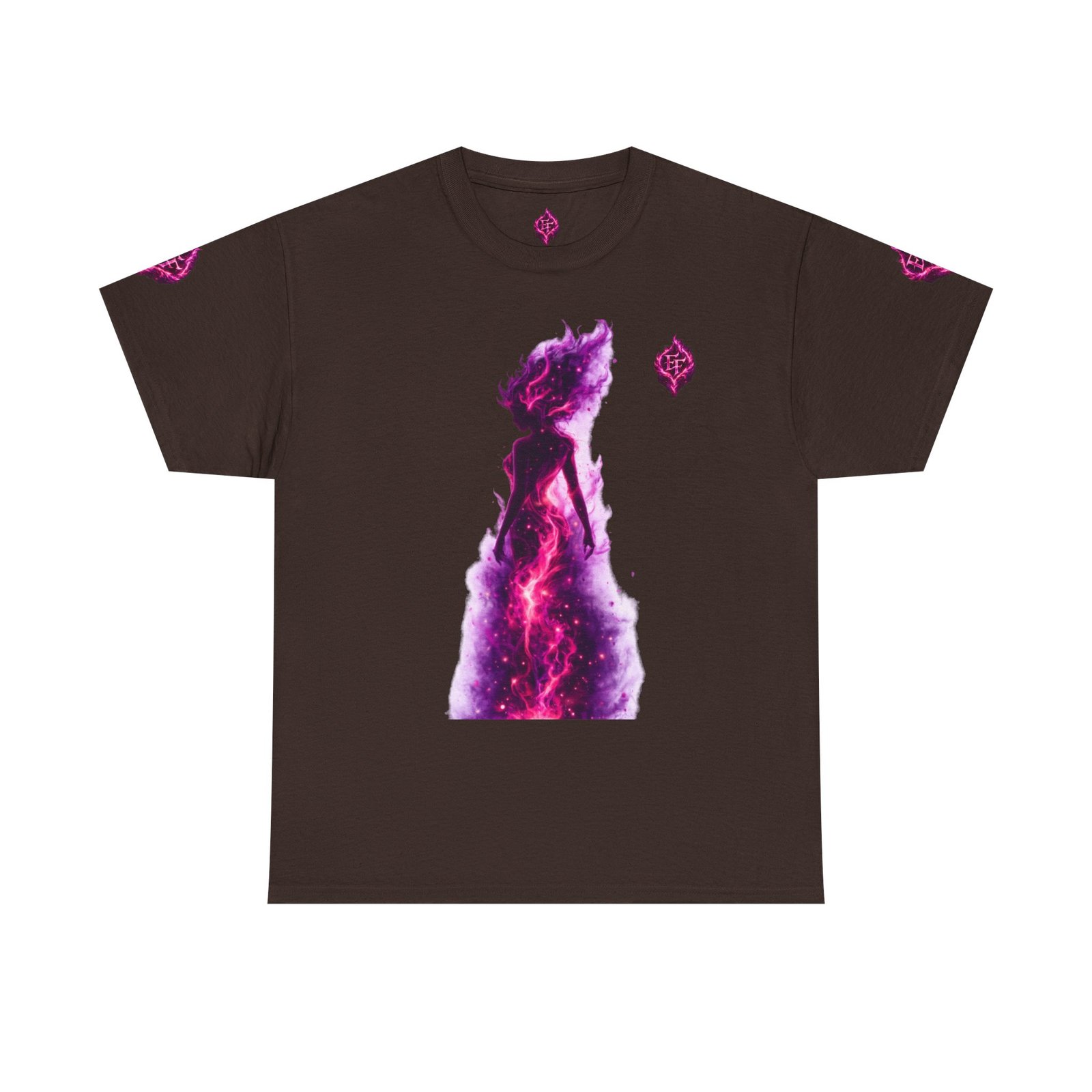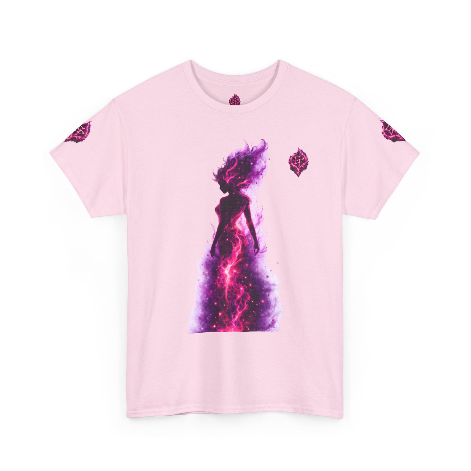 This tee feels like wearing a pulse of starlight. A soft, sturdy cotton canvas carries vibrant magenta-and-violet graphics: a smoldering heart on the chest and a silhouette of a fiery figure on the back, both rendered like cosmic flames. The imagery reads as bold and otherworldly — equal parts galaxy energy and raw emotion — made for someone who wants their outfit to tell a story without saying a word. The classic crew neck and relaxed fit let the art take center stage while staying comfortable for all-day wear. It’s breathable, responsibly sourced, and finished with tear-away labeling so nothing distracts from the look or the feel.